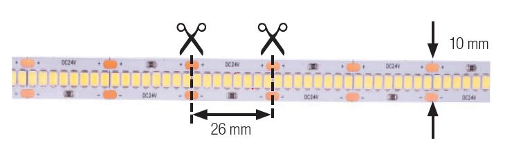 Při odběru kratších LED pásků krátíme na nejbližší kratší dělící místo. Tolerance je cca 1cm na metr délky.