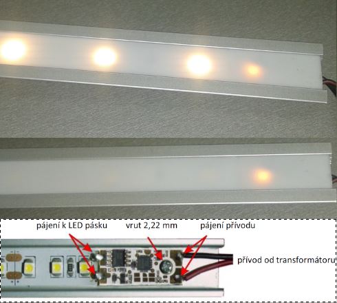 Dotykem kdekolik na ALU profil dojde k sepnutí osvětlení s plynulým náběhem. Druhým dotykem dojde k vypnutí osvětlení. Mezi dotyky musí být cca 1 vteřina prodleva, jinak nebude dotek zaznamenán.