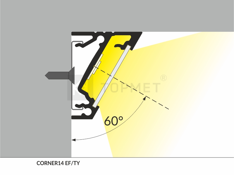 Hliníkový profil k povrchové montáži do rohu. Povrchová úprava - elox stříbrný. Uchycení sponami, nalepením nebo pomocí vrutů. Určený pro LED pásky o max. šířce 14mm. Délka 2000mm. Krycí lišty a koncovky viz. související sortiment níže.