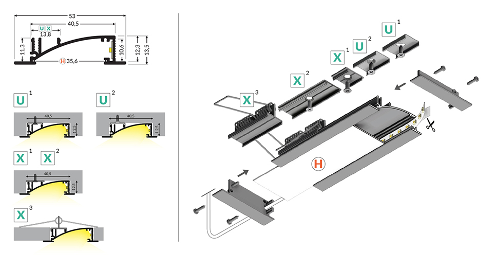 Umístění LED pásku v boku pro rozptýlené světlo nebo možno instalovat i více LED pásků pro přímý svit. Možno instalovat i do sádrokartónu.