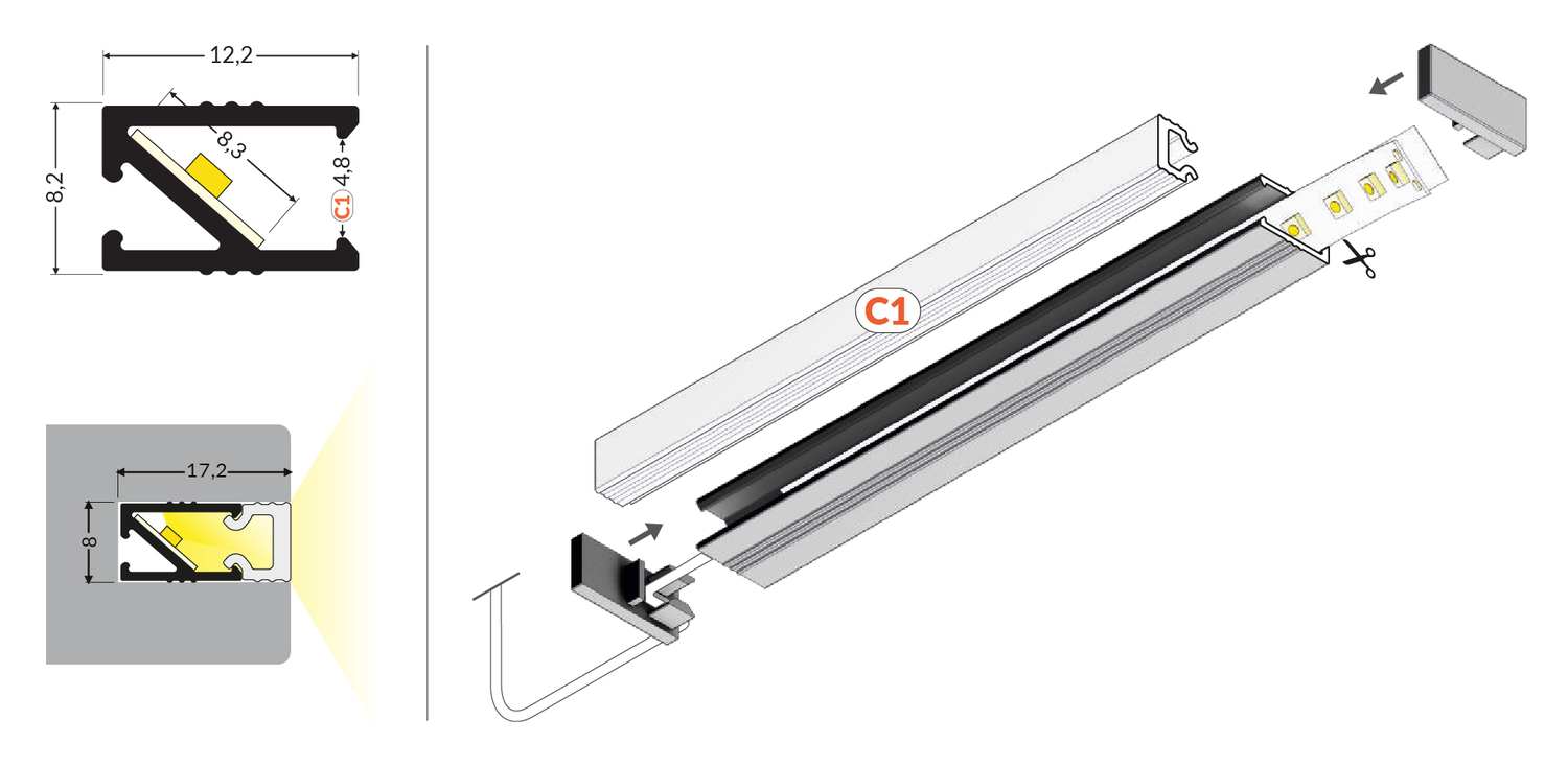 Profil na zafrézování. Rozměry: 2000 x 12,2 x 8,2mm. Frézování 8 x 7,2mm. Materiál: hliník anodovaný.