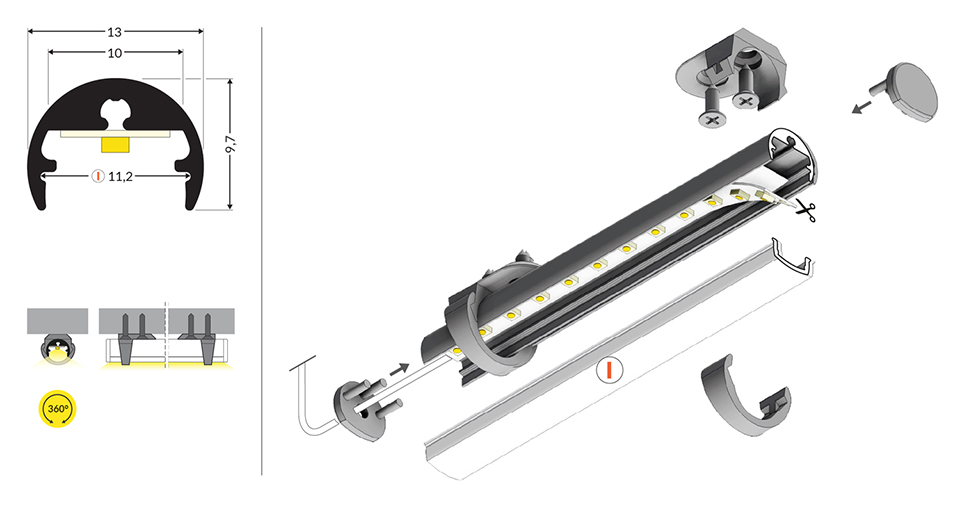 Kulatý ALU profil pro LED pásky o šířce 8mm (2,4W, 4,8W, 9,6W). Vhodné např. pro osvětlení vitrín, výhodou je možnost natočení podle potřeby