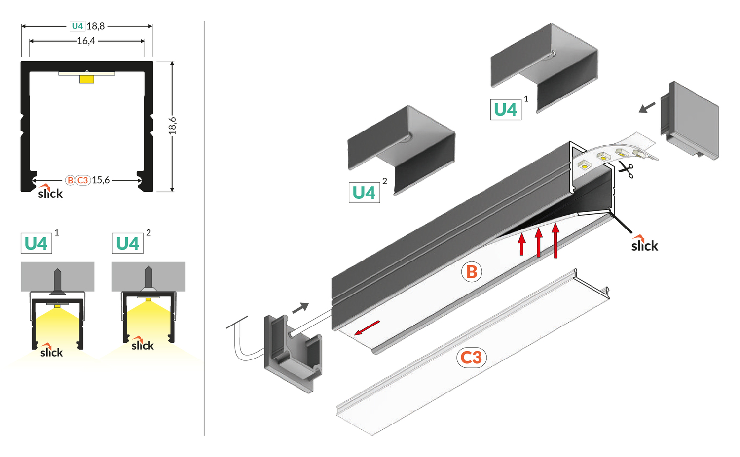 LED profil k povrchové montáži. Při použití LED pásků s minimálně 120 diodami/m a mléčnou krytkou splývá světlo do souvislé linie. Uchycení nalepením nebo přišroubováním. Vhodné nejen do nábytku, ale i na elegantní osvětlení interiéru. LED pásky do šíře 16 mm. Naklapávací krytka (shodná s profily Surface, Groove, Corner...).
