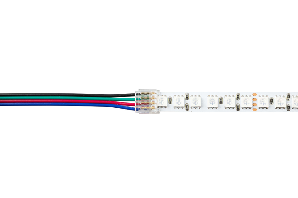Spojka pro spojení RGB LED pásek - kabel (čtyřlinka). Vhodné pro LED pásky šířky 10mm viz. související sortiment. Spojka se na LED pásek nasadí a pomocí kleští se přitlačí kontaktní trny do LED pásku, kdy se trny poté do LED pásku zaříznou. Spojka je tedy určena pro jedno použití. Pro použití v profilech o min. šířce 12mm a výšce 5,1mm.