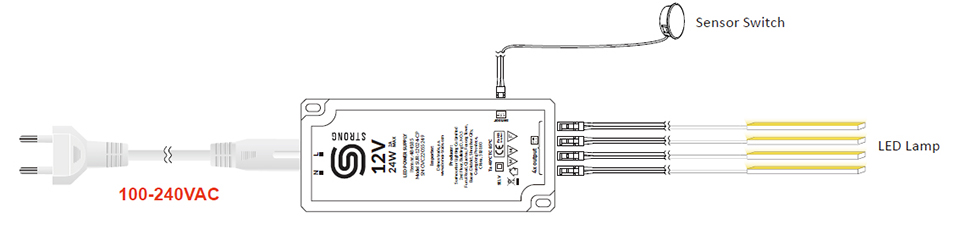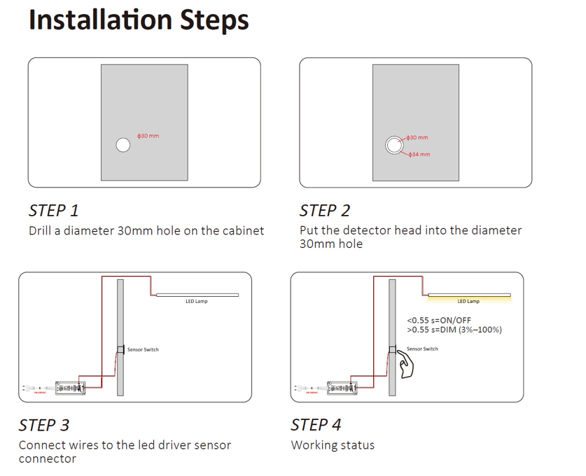 Nejprve vypněte přívod proudu k transformátoru. Vypínač vložte do otvoru o průměru 18 mm a kabel zapojte v 3PIN transformátoru do příslušné zdířky. Až poté připojte transformátor k napájení! Pozor, určeno pouze pro napětí 12 V nebo 24 V DC (stejnosměrný proud). Napětí a spínaný výkon (W) dle použitého transformátoru. Barva černá.