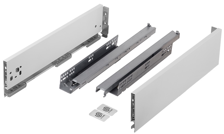 Kompletní sada pro výrobu zásuvky s úzkou (13mm) dutou bočnicí a výsuvy s tlumeným dotahem a vnitřní synchronizací. Nosnost do 40kg. Životnost výsuvů minimálně 50.000 cyklů. Seřízení čela nahoru/dolů a doprava/doleva. Možnost seřízení náklonu celé zásuvky v zadní části bočnice (slouží k seřízení náklonu čela). Pro výrobu dna a zad nutno použít materiál tloušťky 16mm.