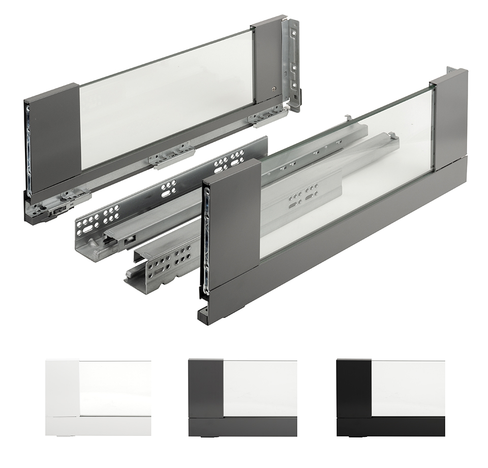 Kompletní sada pro výrobu zásuvky s úzkou (13mm) dutou bočnicí a výsuvy s tlumeným dotahem a vnitřní synchronizací. Nosnost do 40kg. Životnost výsuvů minimálně 50.000 cyklů. Seřízení čela nahoru/dolů a doprava/doleva. Možnost seřízení náklonu celé zásuvky v zadní části bočnice (slouží k seřízení náklonu čela). Pro výrobu dna a zad nutno použít materiál tloušťky 16mm.