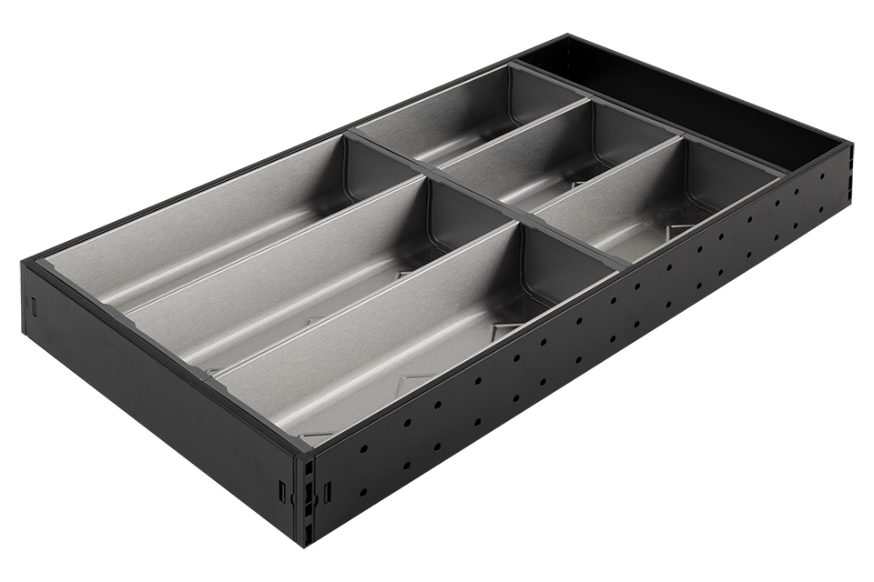 Příborník do StrongMax 16. Kompletní příborník 276x523mm. Sada pro sestavení příborníků pro všechny šíře zásuvek. V sadě jsou 3 misky o délce 264mm a 3 misky o délce 176mm. Je možno rozšířit o 88, 176, nebo 264mm. černá. Výška systému je 59mm.