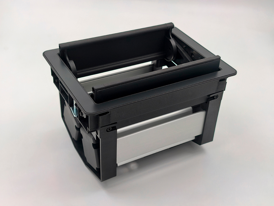 Dvojité otevírací víko s jedním nebo dvěma zásuvkovými moduly uvnitř Po zavření zůstane upropstřed mezera na průchod kabelů