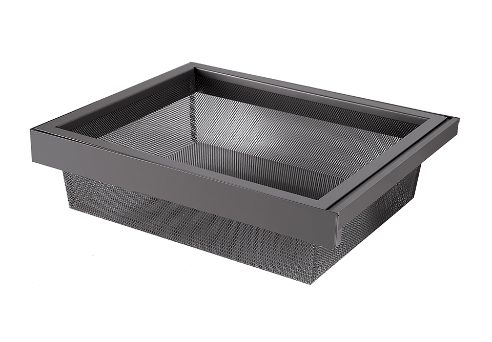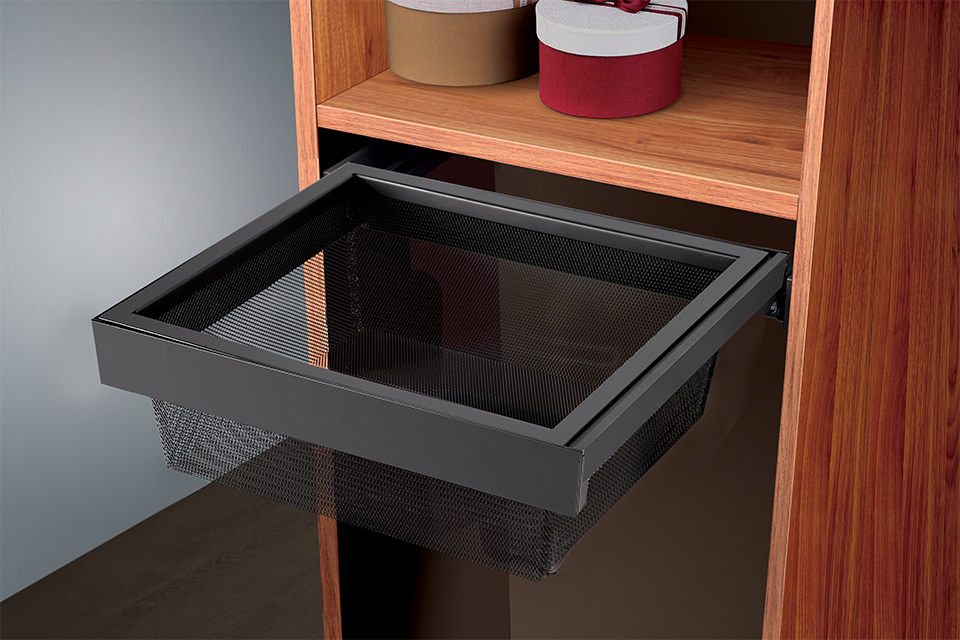 Chytrý výrobek: díky tmavému odstínu povrchové úpravy nenápadný pomocník. Koše zajišťují přehled a hlavně vzdušnost (uložené prádlo větrá a vydrží déle voňavé). Řada výrobků pro šatní skříně Strong je komplexní a tak v ní najdete prvky pro uložení veškerého oblečení, doplňků a dokonce i bot. Zajímavým řešením je například trezor otevírající se pomocí otisku prstu nebo otočný botník pro uložení opravdu velkého množství bot (až 30 párů).