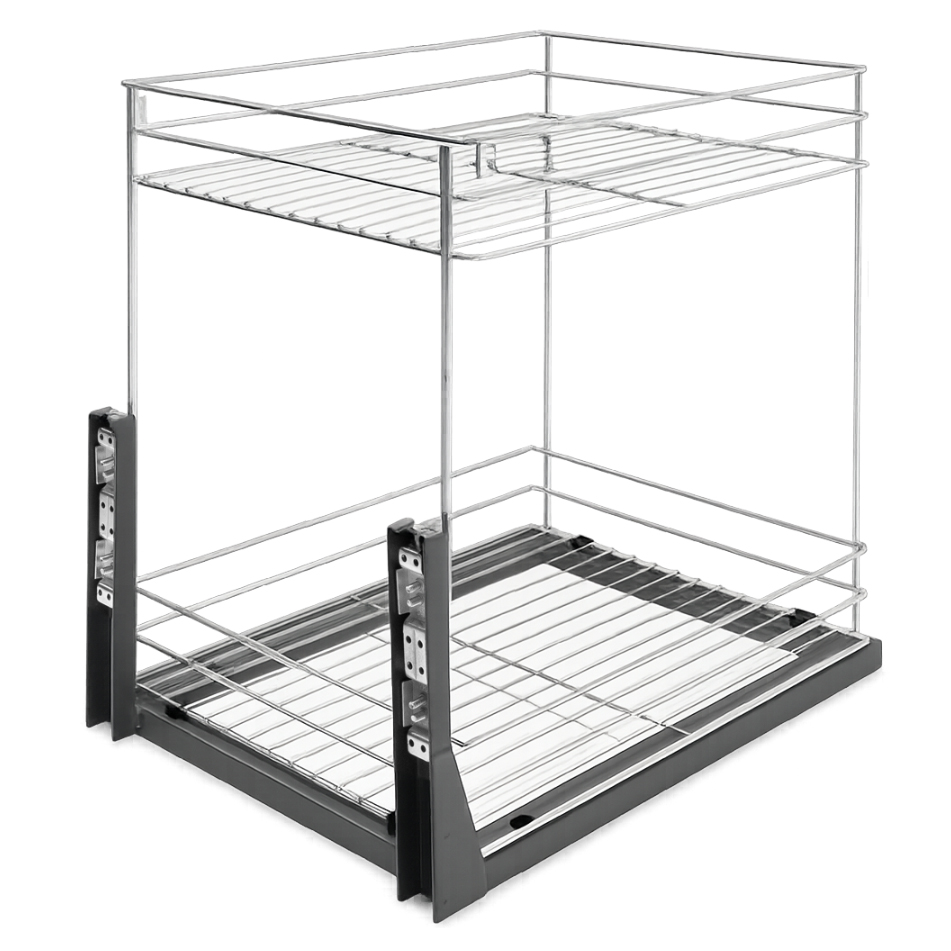 Dvojkoš spodní pro 300mm vnější šíři korpusu. Rozměry: šíře 260, hloubka 455, výška 535mm. Provedení chrom. Skrytý celovýsuv Strong s dotlumením při zavírání.