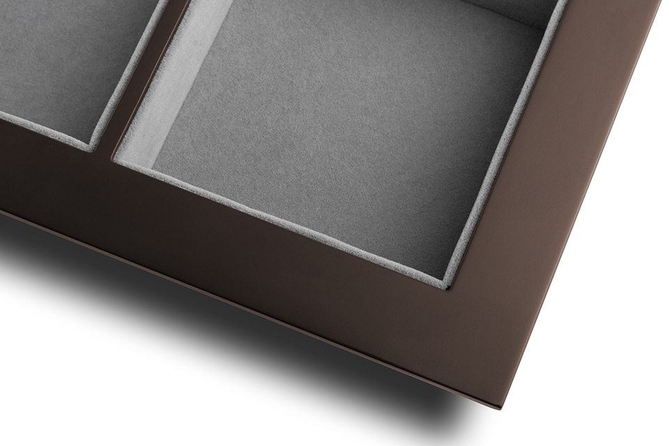 Elegantní, čistý design v módním tmavě hnědém provedení v kombinaci s šedým vkladem pro uložení šperků, parfému či jiných drobností. Pevný rám se skrytým výsuvem s integrovaným tlumením. Šířka korpusu - 900 mm. Minimální potřebná výška v korpusu 65mm.