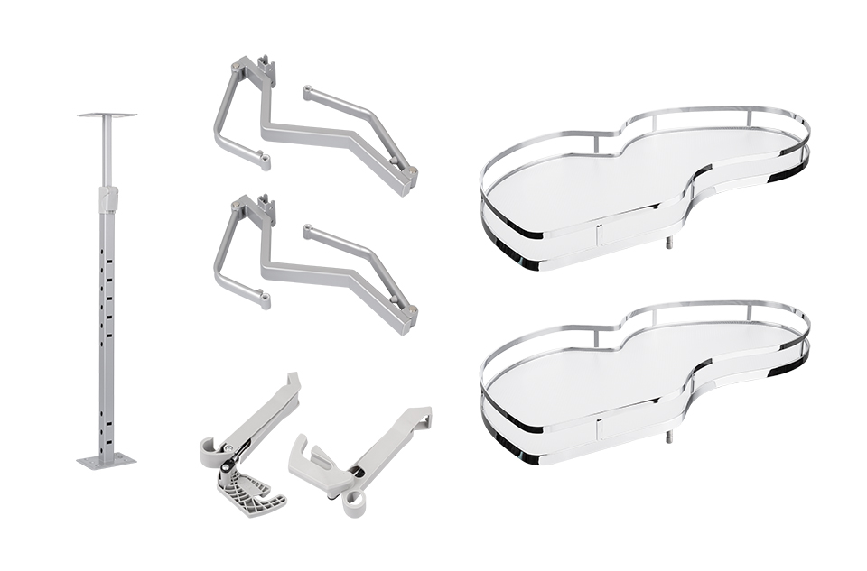 Sada 2 výsuvných polic pro spodní rohovou skříňku. Levá varianta při zavírání s dotlumením. Pro korpus šíře 900 mm. Sada včetně ramen a montážních prvků pro uchcení do korpusu.