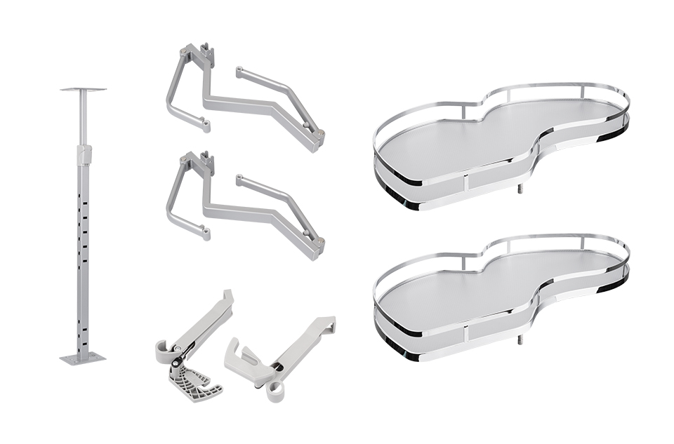 Sada 2 výsuvných polic pro spodní rohovou skříňku. Levá varianta při zavírání s dotlumením. Pro korpus šíře 900 mm. Sada včetně ramen a montážních prvků pro uchycení do korpusu.