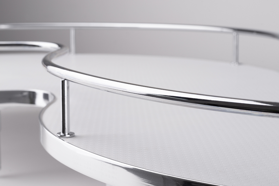 Sada 2 výsuvných polic pro spodní rohovou skříňku. Levá varianta při zavírání s dotlumením. Pro korpus šíře 900 mm. Sada včetně ramen a montážních prvků pro uchcení do korpusu.