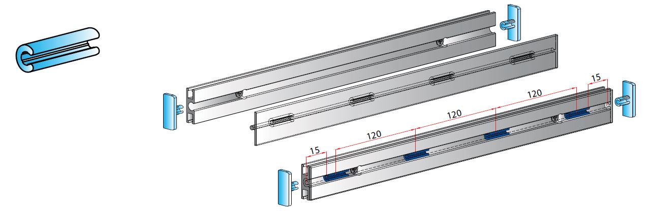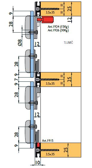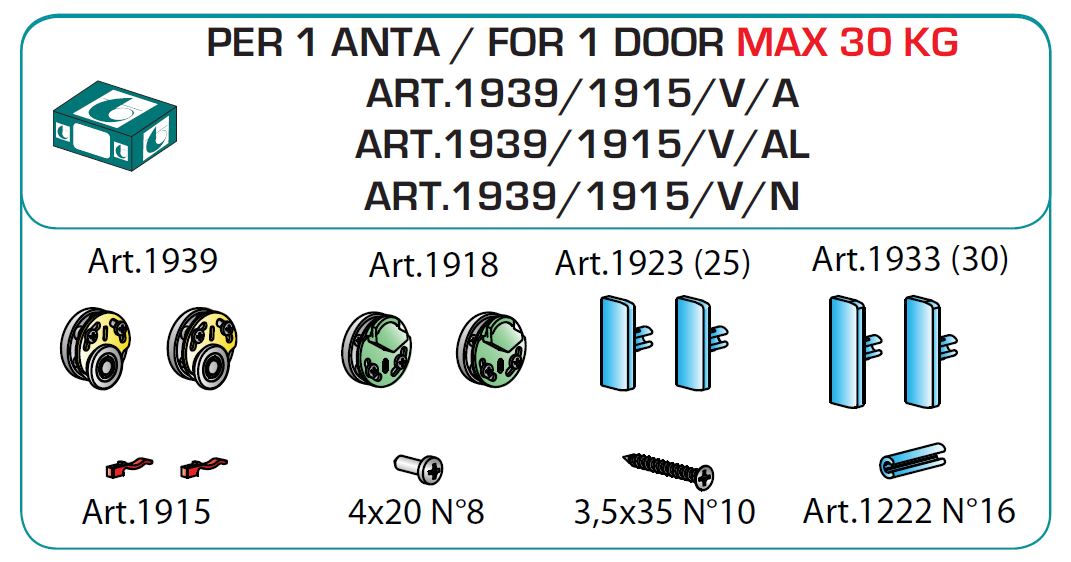 Sada kování pro jedny naložené skleněné dveře bez tlumení. Max. nosnost 30 kg, tloušťka skla 4 - 6mm. Vhodné profily viz. související sortiment.
