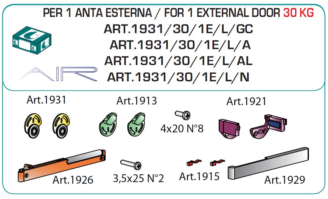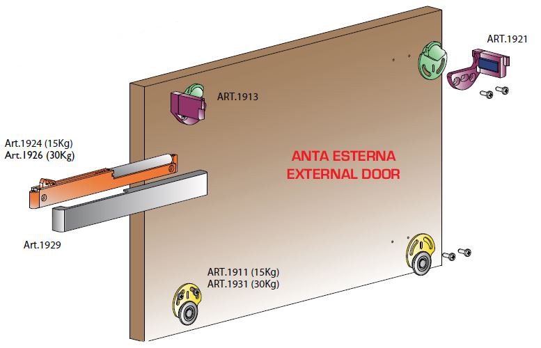 Sada kování pro jedny vložené dřevěné dveře vnější s tlumením. Max. nosnost 30 kg, tloušťka výplně max. 27mm. Vhodné profily viz. související sortiment.