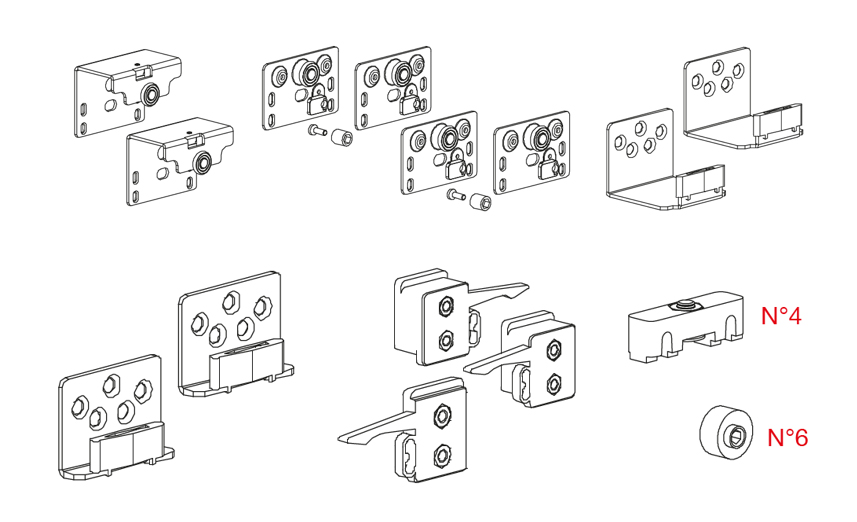 Sada kování pro 3 křídla. Brzda na prostředních dveřích vpravo, tzn otevírání pouze doleva. Tloušťka lamina max.22mm. Nosnost 30kg. Místo brzdy pro prostřední křídlo je možno použít oboustrannou brzdu DT232 umožňující otevření křídla na obě strany.