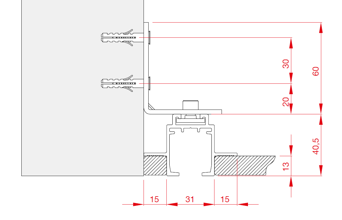 Horní vedení pro posuvné interiérové dveře. Vhodné pro použití v sádrokartónovém podhledu. Příslušenství viz. související sortiment Délka 6m. Materiál - eloxovaný hliník.