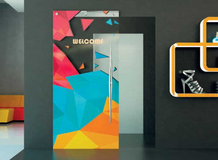 Kompletní sada kování pro skleněné dveře, umožňující zhotovit posuvné dveře bez viditelné kolejnice (při otevřeném i zavřeném stavu!).
