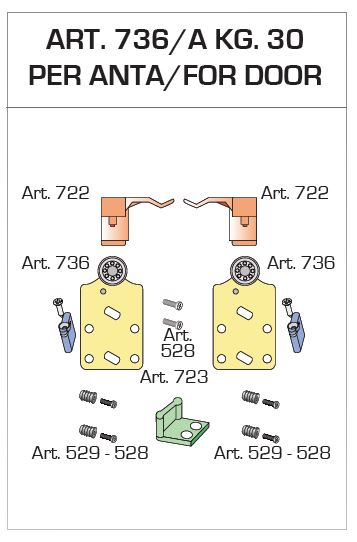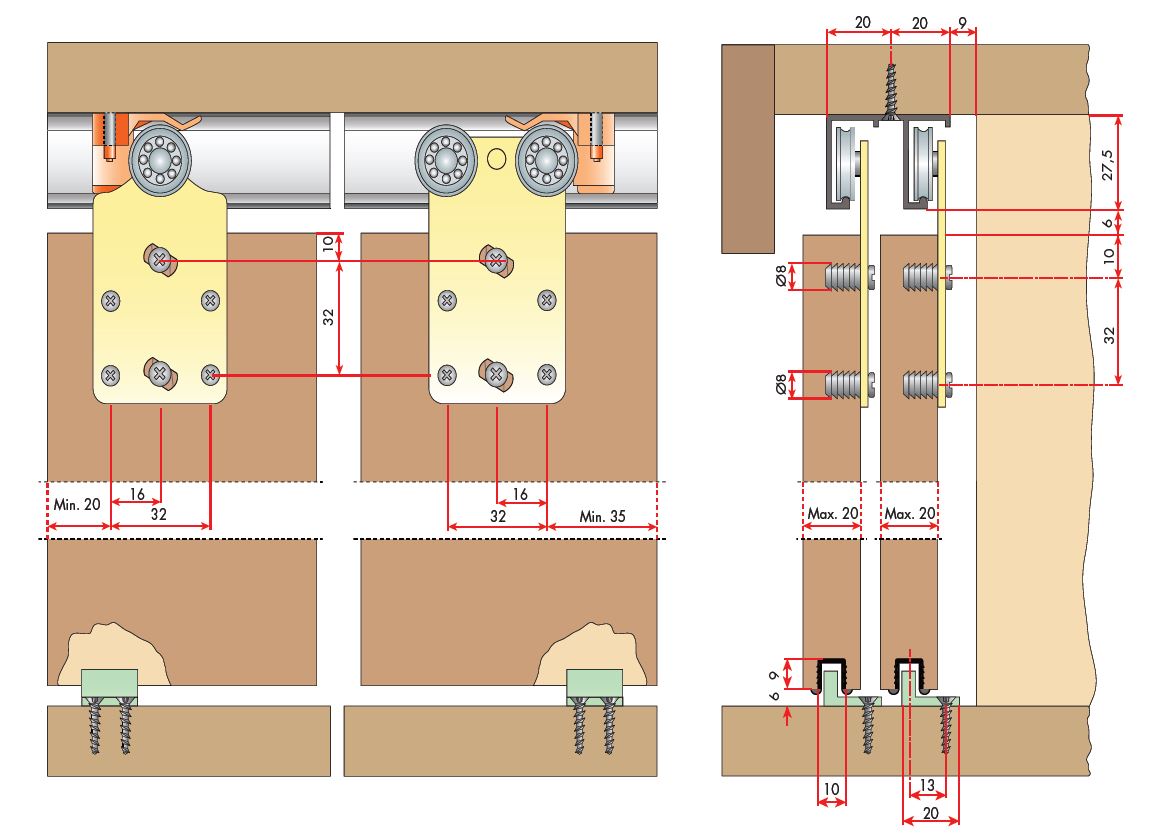 Sada kování pro jedno křídlo včetně vodícího trnu. Max. nosnost 30 kg. Tloušťka DTD max. 20mm. Horní profil jednoduchý: DT364 - DT366. Horní profil dvojitý: DT367 - Dt369 Spodní plastový profil na zafrézování: DT370.