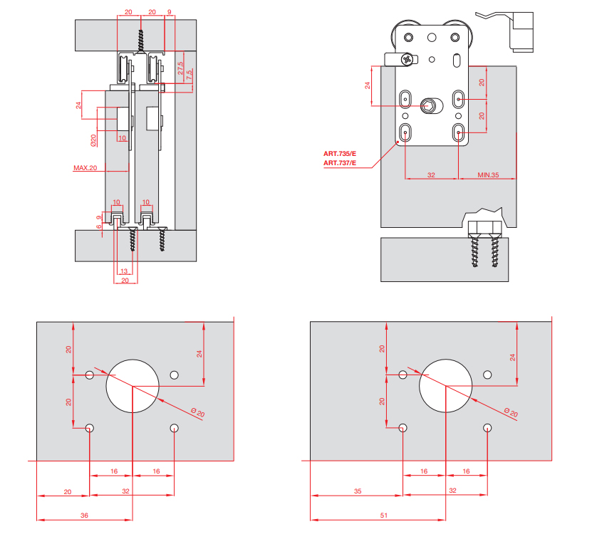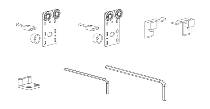 Sada kování pro jedno křídlo včetně vodícího trnu. Max. nosnost 50 kg. Tloušťka DTD max. 20mm. Horní profil jednoduchý: DT364 - DT366. Horní profil dvojitý: DT367 - Dt369 Spodní plastový profil na zafrézování: DT370.