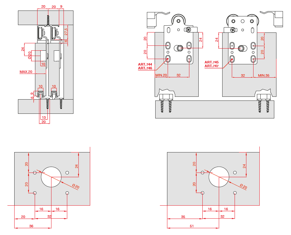 Sada kování s ložiskem pro vložené posuvné dveře s horním vedením o max. váze 50kg.