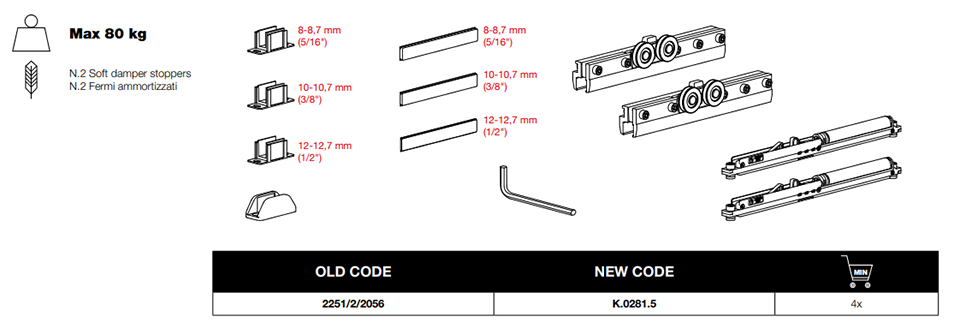 Sada kování pro skleněné dveře. Tloušťka skla 8 -12,7mm. Nosnost 80 kg, 2x hydraulický tlumič, pomalý dojezd 70mm