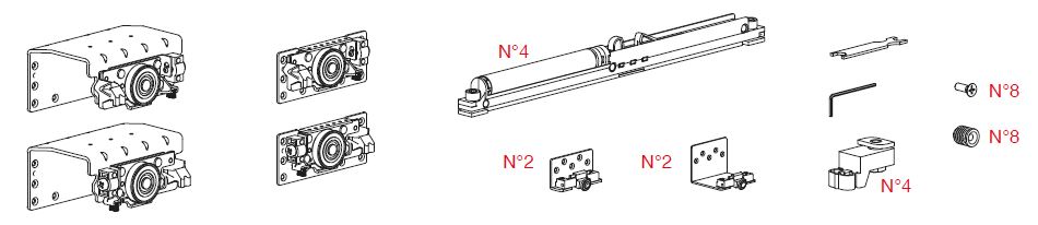 Sada kování pro 2 křídla včetně vzduchových tlumičů (4 ks). Tloušťka lamina max.25mm. Pro hmotnost křídla 40 - 80 kg. Min.šířka křídla - 600mm. Upozorňujeme, že u tohoto typu kování je křídlo zavěšeno mimo těžiště a může dojít k průhybu křídla (platí obecně pro naložené systémy). K vyrovnání napětí slouží výztuhy 88040 - krátitelná a DT157 - nad výšku 2,3m - pevnější provedení pro vyšší namáhání (kat.2014 str. 5.80).