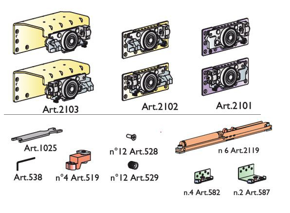 Sada kování pro 3 křídla včetně vzduchových tlumičů (6 ks). Tloušťka lamina max.22mm. Hmotnost křídla 40 - 80kg.Min.šířka křídla - 650mm. Upozorňujeme, že u tohoto typu kování je křídlo zavěšeno mimo těžiště a může dojít k průhybu křídla (platí obecně pro naložené systémy). K vyrovnání napětí slouží výztuhy 88040 - krátitelná a DT157 - nad výšku 2,3m - pevnější provedení pro vyšší namáhání (kat.2014 str. 5.80)