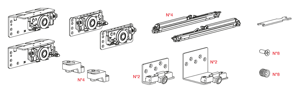 Sada kování pro 2 křídla včetně kapalinových tlumičů (4 ks). Tloušťka lamina max. 28mm. Pro hmotnost křídla max. 80 kg. Min.šířka křídla - 750mm. Upozorňujeme, že u tohoto typu kování je křídlo zavěšeno mimo těžiště a může dojít k průhybu křídla (platí obecně pro naložené systémy). K vyrovnání napětí slouží výztuhy dveří viz. související sortiment.