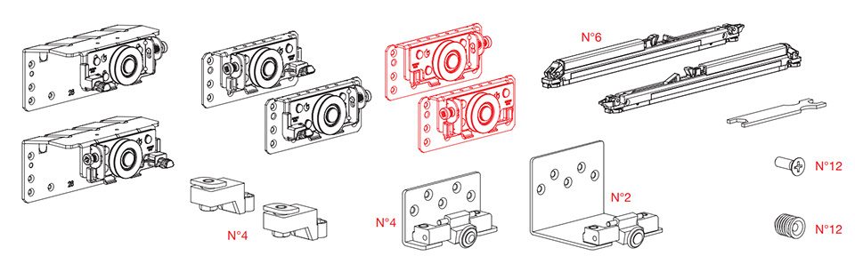 Sada kování pro 3 křídla včetně kapalinových tlumičů (6 ks). Tloušťka lamina.25 - 28mm. Pro hmotnost křídla max. 40 kg. Min.šířka křídla - 750mm. Upozorňujeme, že u tohoto typu kování je křídlo zavěšeno mimo těžiště a může dojít k průhybu křídla (platí obecně pro naložené systémy). K vyrovnání napětí slouží výztuhy dveří viz. související sortiment.