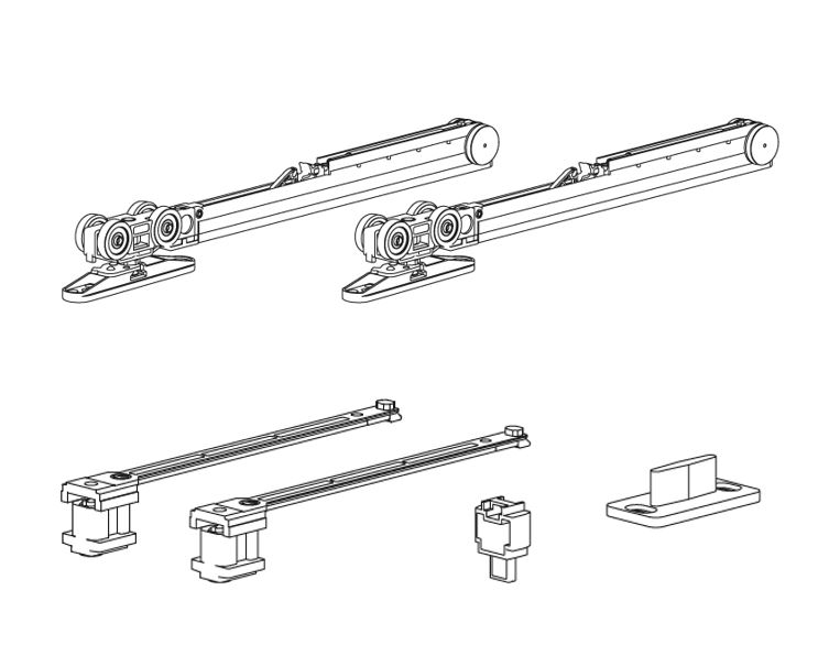 Nosnost dveří - max.160kg. Sada obsahuje kování na 1 křídlo bez příchytů na zeď. Minimální šířka křídla 865mm. Jednoduchá montáž i demontáž. Držáky vozíkú je možno zafrézovat, čímž se zmenší mezera mezi dveřmi a horním vedením až o 11mm.