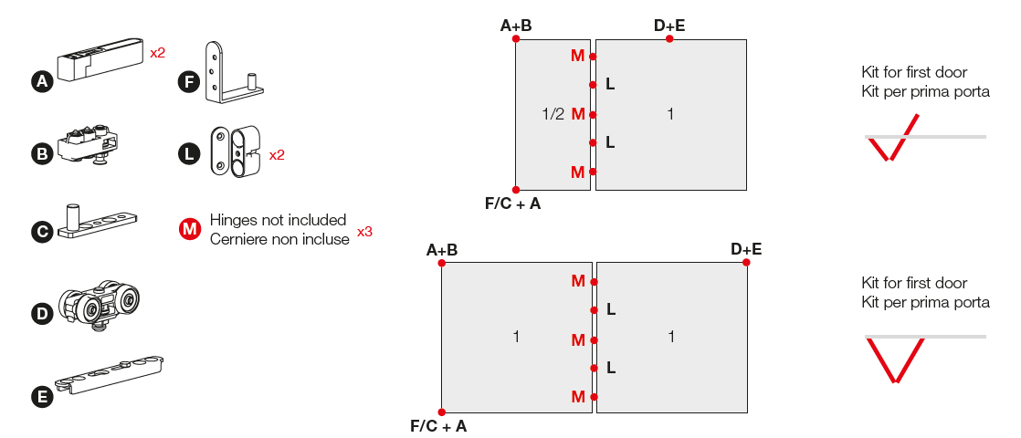 Sada kování pro první dvojkřídlo. Obsahuje dvě magnetické aretace, bez skládacích a mezidveřních závěsů. Verze bez spodního vedení. Pro výšku dveří max. 2400mm, nosnost 80kg/1 křídlo. V případě čtyř dveří - 40kg/1 křídlo, šesti dveří - 25 - 30kg/1 křídlo. Tloušťka materiálu 30 - 45mm. Barva černá (práškově lakovaná).
