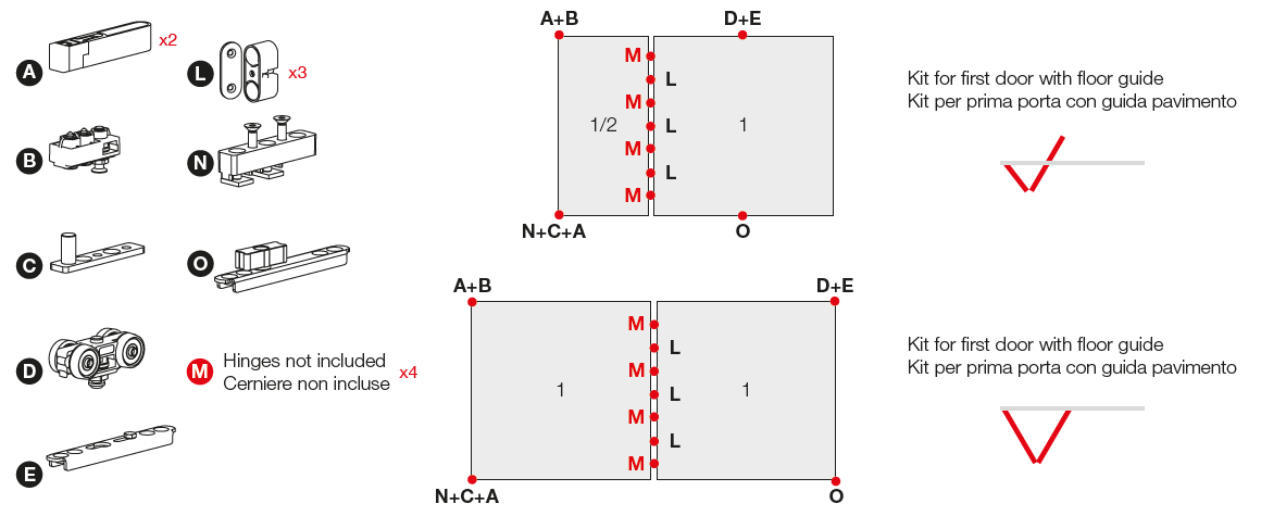 Sada kování pro první dvojkřídlo. Obsahuje tři magnetické aretace, bez skládacích a mezidveřních závěsů. Verze se spodním vedením. Pro výšku dveří 2400 - 3000mm, nosnost 80kg/1 křídlo. V případě čtyř dveří - 40kg/1 křídlo, šesti dveří - 25 - 30kg/1 křídlo.Tloušťka materiálu 30 - 45mm. Barva černá (práškově lakovaná).