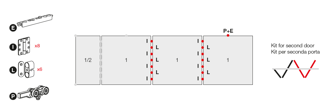 Sada kování pro posuvné dvojkřídlo. Obsahuje šest magnetických aretací a osm mezidveřních závěsů. Verze bez spodního vedení. Pro výšku dveří 2400 - 3000mm, nosnost 40kg/1 křídlo. V případě šesti dveří - 25 - 30kg/1 křídlo. Tloušťka materiálu 35 - 40mm. Barva černá (práškově lakovaná).