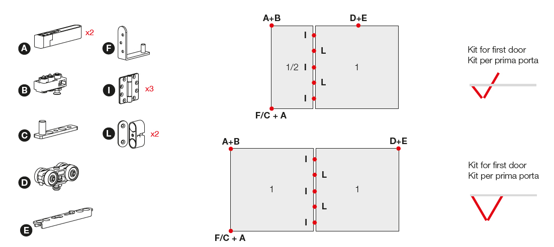 Sada kování pro dvě křídla s mezidveřními závěsy (3 ks) a magnetickou aretací (2 ks). Verze bez spodního vedení. Pro výšku dveří max. 2400mm, nosnost 80kg/1 křídlo. V případě čtyř dveří - 40kg/1 křídlo, šesti dveří - 25 - 30kg/1 křídlo.Tloušťka materiálu 35 - 45mm. Barva černá (práškově lakovaná).