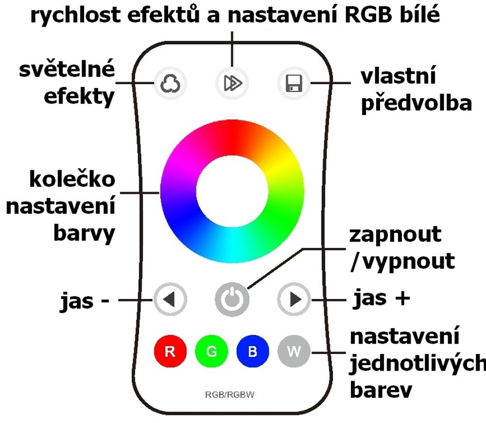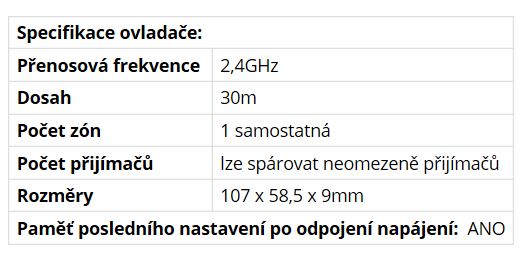 Dálkový ovladač dimLED OVS RGBW 1KR je bezdrátový radiofrekvenční ovládací systém, jednoho ovladače a několik přijímačů. S jedním ovladačem lze ovládat 1 zónu, která se může skládat z několika přijímačů. Tyto přijímače se po sehrání s ovladačem ovládají jako jedna sekce. Ovladač lze použít pro RGB pásky s přijímačem RGB nebo pro RGBW pásky s RGBW přijímačem. Přijímač může být ukrytý (za zdí, sádrokartónem či ve skříni), není nutná přímá viditelnost přijímače pro ovladač. Vlastnosti a výhody systému dimLED: Stmívání je stabilní a spolehlivé, dosah ovladače ? 30M. Stmívání v rozmezí 0-100%, 256 úrovní stmívání, stmívání měkké, bez blikání. Při zapnutí dojde k pozvolnému rozsvícení, při vypnutí dojde k pozvolnému setmění.