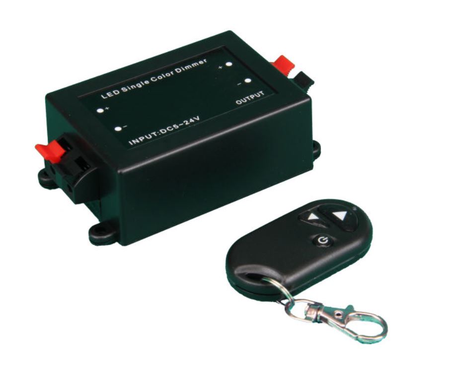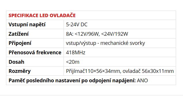 Stmívač jednokanálový RF - radiofrekvenční dálkové ovládání intensity jasu LED pásků, žárovek 5-24V a jednobarevných modulů. Přijímač může být ukrytý (za zdí, sádrokartónem či ve skříni), není nutná přímá viditelnost přijímače pro ovladač. Nově má tento ovladač má při zapnutí a vypnutí náběh - rychlé ale pozvolné rozsvícení či vypnutí. Napárování ovladače: držte na ovladači zároveň obě tlačítka - šipky, připojte přijímač ke zdroji, připojený pásek problikne nebo zhasne, potom pusťte obě tlačítka. Hotovo