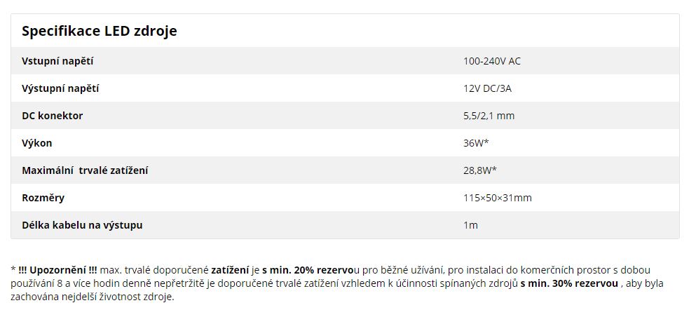 Vstupní napětí 180-264V AC. Výstupní napětí 12VDC/6A. Výkon 36W*. Krytí IP20. Rozměry 115x50x31mm. !!! Upozornění !!! max. trvalé doporučené zatížení je s min. 20% rezervou pro běžné užívání, pro instalaci do komerčních prostor s dobou používání 8 a více hodin denně nepřetržitě je doporučené trvalé zatížení vzhledem k účinnosti spínaných zdrojů s min. 30% rezervou , aby byla zachována nejdelší životnost zdroje.