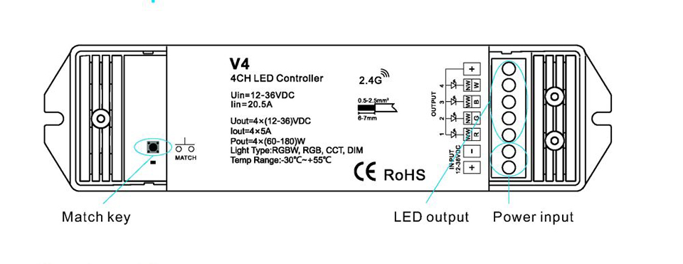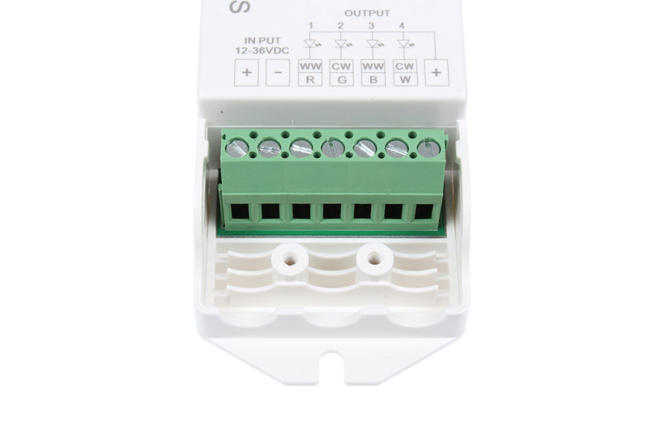 Radiofrekvenční přijímač stmívač pro RGBW LED produkty. Přijímač může být ukrytý (za zdí, sádrokartónem či ve skříni), není nutná přímá viditelnost přijímače pro ovladač. Přijímač je kompatibilní s RGBW ovladači řady dimLED a jednobarevným ovladačem OVL 4ALL!!! Pro ovládání více okruhů je nutno použít jeden přijímač na každý okruh. Na každý přijímač lze napárovat až 10 různých ovladačů řady dimLED a tak ovládat z několika míst. V případě přerušení a poté opětovného připojení napájení (například přerušením napájení zdroje) má tento přijímač paměť nastavení intenzity (intenzita osvětlení se vrátí na naposled nastavenou).