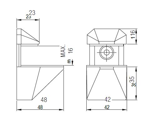 Šířka 42mm, výška 55mm, hloubka 48mm Nosnost páru při 30 cm šíři = 30 kg. Maximální tloušťka materiálu - 16mm.