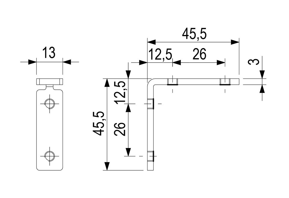 Rozměr délka 50 mm, šířka 13 mm, tloušťka 3 mm. Součástí balení jsou šroubky k profilu.
