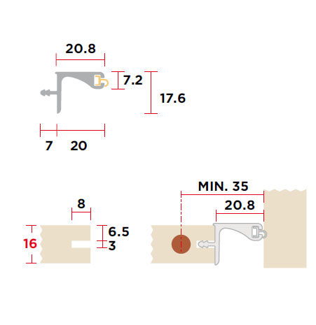 Profil pro bezúchytkové otevírání horních skříněk. Profil pro skříňku se dnem 16mm, odstup od skříňky 20,8mm = montážní rozměry shodné s profilem 156848