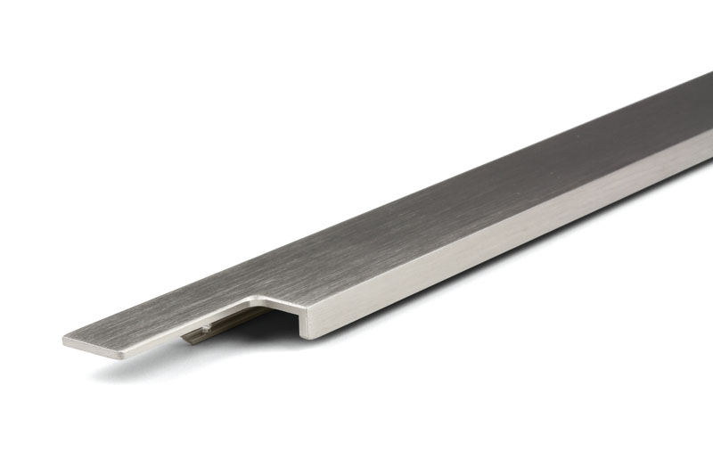 Narážecí úchytový profil. Rozměr drážky pro frézování: 3mm. Nedoporučujeme kombinovat s podobným objednávkovým úchytovým profilem, vyráběným na míru. Profily se nebudou shodovat v povrchové úpravě ani rozměrově a na případné reklamace k nekompatibilitě nebude brán zřetel.