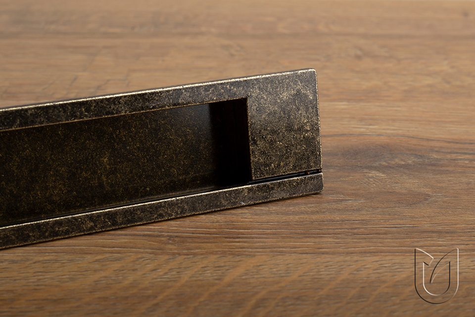 úchytka rozteč: 192 mm, celková délka: 216 mm, šířka: 40mm, výška: 16 mm, povrch: patinovaný (tmavý) bronz, rozměry zahloubení (frézování) 14x35x211, neobsahuje šroubky