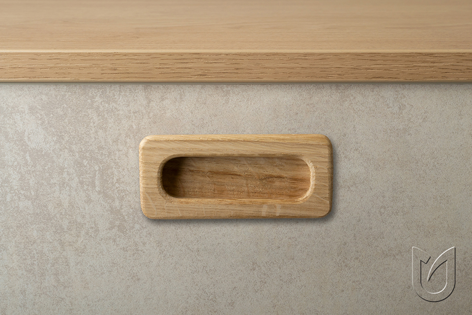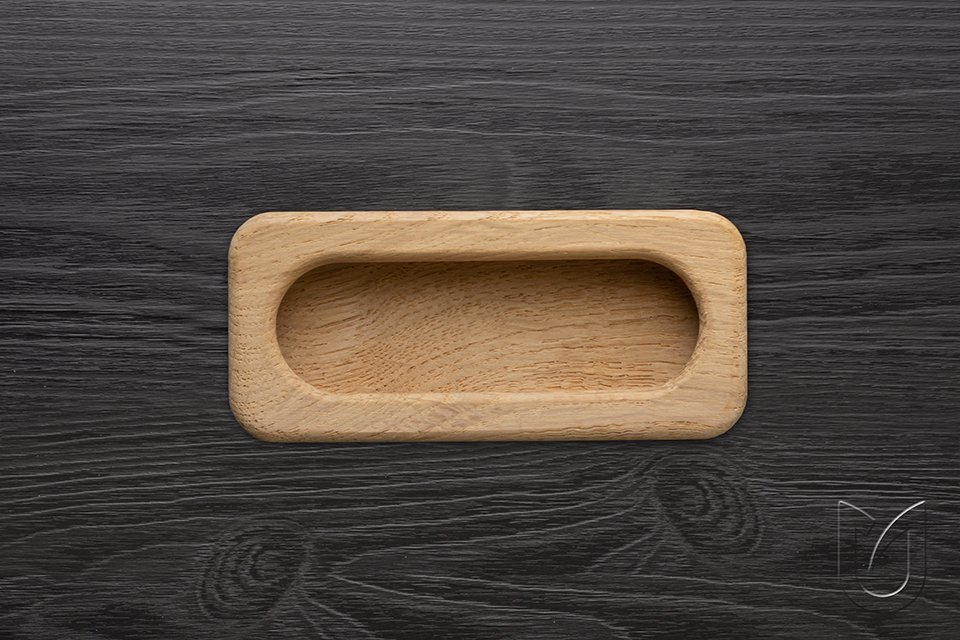 Zápustná úchytka, hloubka : 14 mm, celkková šířka 47 mm, celkové délka : 107 mm. Materiál : buk surový