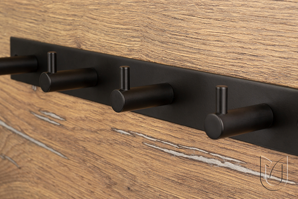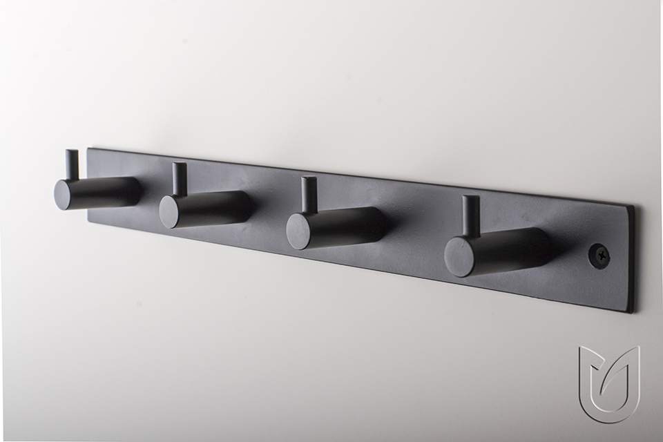 Kovová věšáková lišta se 4mi háčky. Vruty s černou hlavou, vč. hmoždinek k připevnění do stěny jsou součástí balení.