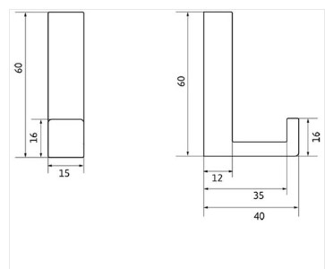 věšák přední montáž, povrch broušený nikl, šířka 15 mm, výška 60 mm, hloubka 40 mm. Rozteč vrtání 32 mm. obsahuje šroubky.