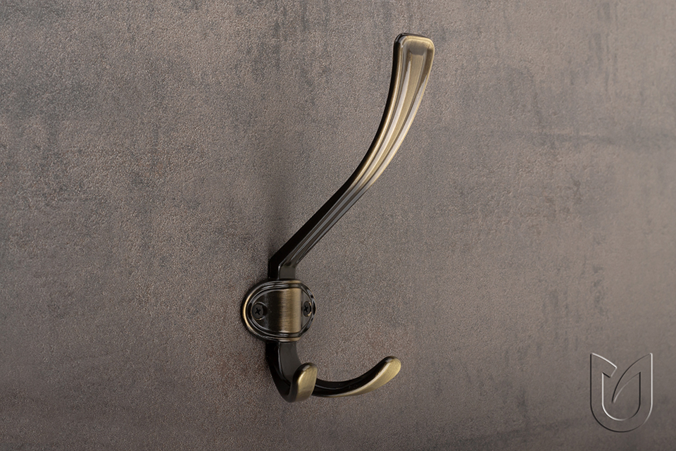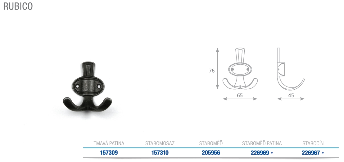 věšák šířka 65 mm, výška 76, délka 45 mm, povrch patinovaný kov. Rozteč šroubků - 32mm.
